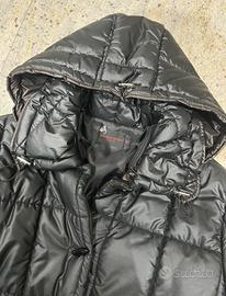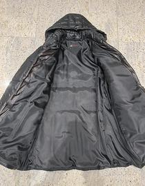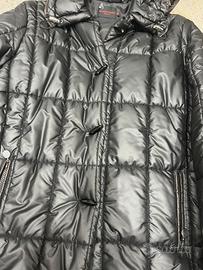Modello leggermente sfiancato, chiusura con bottone, colletto alto e avvolgente, cappuccio staccabile, tasche con cerniera