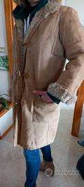 Vendesi giubbotto Shearling in vera pelle scamosciata color beige/cammello, caldo e avvolgente, ideale per l’inverno. Interno completamente foderato in montone morbido con bordo a vista su colletto e polsini.