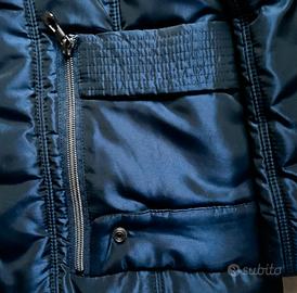 Taglia M, blu scuro leggermente satinato, imbottitura medio-pesante, cappuccio e vestibilità sfiancata con dettagli arricciati in vita 🔵✨