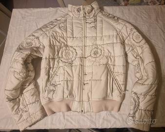 Design: Si tratta di un piumino corto (modello bomber) di colore bianco/panna, caratterizzato da una trapuntatura orizzontale accostata a un'elaborata lavorazione a ricamo con motivi geometrici e circolari (simili a mandala o fiori stilizzati) realizzati con filo a contrasto.