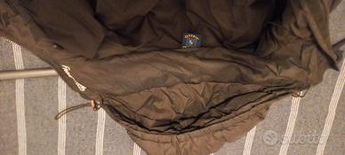 Giubbotto marrone in piumino con cappuccio regolabile, due tasche interne – con un piccolo danno (goccia di colla) – regolazione in vita- caldissimo