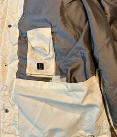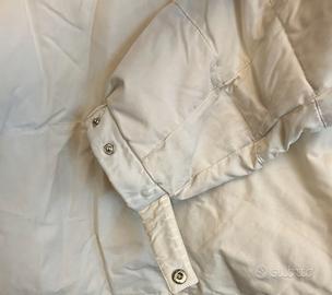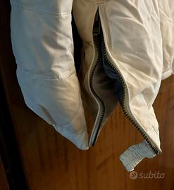 Giubbotto imbottito bianco panna, con cappuccio rimovibile con 5 bottoni automatici, coulisse nel giro volto, striscia di pelliccia nel giro volto rimovibile con cerniera a scomparsa. Due tasche ai pettorali che si chiudono con 2 bottoni automatici, due tasche sui fianchi con cerniera, chiusura sul fronte a tutto collo con cerniera a doppio cursore e/o con 6 bottoni automatici. Spacchi sui fianchi con chiusura a cerniera o con cinturino elastico ad aggancio con bottoni automatici. Tasca interna con chiusura a cerniera ad altezza pettorale, due ampie tasche interne sui fianchi con chiusura in velcro, taschino interno per telefono. Esterno in 100% nylon, interno 53% poliestere e 47% nylon, imbottitura in 100% piumino sterilizzato. Taglia XXL. Dimensioni interne: distanza sottomanica 73 cm. Distanza spalle 58 cm. Altezza da girocollo 81 cm.