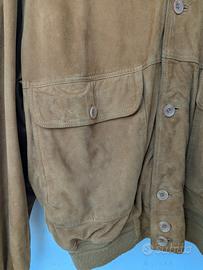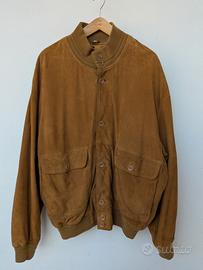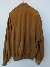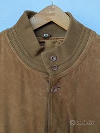 Giacca bomber in morbida pelle scamosciata. - Chiusura con bottoni. - Due tasche frontali con patta e bottone. - Collo alto in lana a costine. - Polsini e fondo in lana a costine. - Larghezza spalle cm 58 - circonferenza torace cm 134 - Lunghezza manica cm 64 - Lunghezza totale cm 71 - Ha una piccola abrasione sulla spella dietro ma non è bucato - Da rinfrescare con apposito lavaggio