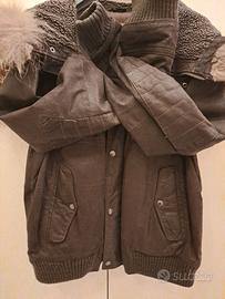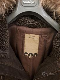 Giubbotto da uomo in crosta di pelle, colore marrone testa di moro, con zip in metallo, imbottitura trapuntata, cappuccio in pelliccia rivestito in lana Alpaka, taglia 56, spalle 55 cm, manica 65 cm, interno ed esterno integro, pulito, vissuto non consumato, non sporco, non graffi profondi, in buone condizioni.