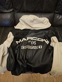 Giubbotto in pelle nappata prima scelta artigianale. Fodera in tessuto leggero nero gessato. Colore nero con maniche e cappuccio avorio. Cappuccio separabile con zip. Taglia XXL. Modello motociclista. Logo team Martini 2006 sulle spalle e su una manica.