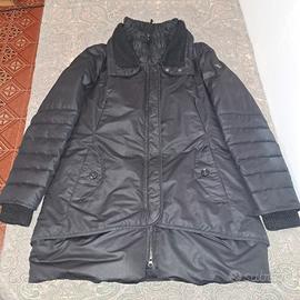 Giubbotto invernale da donna color nero con imbottitura in vero piumino d'oca, taglia M , marca "Dek'Her", 100% poliestere (interno), 75% poliestere (esterno), con una piccola tasca interna nel lato sx alto, 2 tasche laterali con zip esterne all'altezza del petto + 2 tasche laterali esterne aperte sui fianchi, chiusura con cerniera ed automatici a supporto.