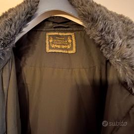 Giaccone mai indossato ,verde militare con pelliccia sul collo e cappello per la pioggia,cintura incorporata i vita .Si allaccia con chiusura lampo e bottoni. La misura è una XL calza anche XXL.