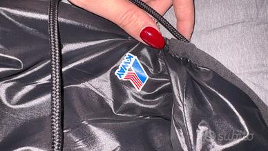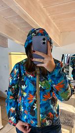 vendo giubbotto k way primaverile double face, da una parte nero e da un altro parte stampa floreale/tropicale azzurra e arancione.