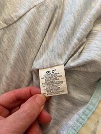 Giacca a vento Kejo color cielo. Con bottoni, 2 tasche frontali e 2 laterali. Scritta Kejo ricamata sulla manica sinistra. Ricamo tono su tono sulla schiena. Il rivestimento in plastica del taschino interno, come si vede dalla foto, si è danneggiato ma dall’esterno non è visibile.