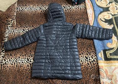 Questo è un giubbotto leggero trapuntato/imbottito (spesso chiamato piumino leggero) di colore nero o grigio scuro. È caratterizzato da una trapuntatura orizzontale che trattiene l'imbottitura, rendendolo caldo ma non ingombrante. • Design: Presenta un taglio lungo, che arriva all'incirca a metà coscia (dipende dall'altezza di chi lo indossa), offrendo maggiore copertura. • Chiusura: Dotato di una cerniera a tutta lunghezza sul davanti. • Dettagli: Ha un cappuccio integrato per protezione extra da pioggia e vento. Sembra avere due tasche laterali con apertura a filetto o con zip nascosta. • Condizione: Dalle foto sembra essere in ottime condizioni, con una finitura leggermente lucida o "glossy". È un capo molto versatile e pratico, ideale per la mezza stagione o come strato aggiuntivo sotto cappotti più pesanti in inverno