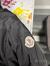 Giubbotto Moncler nero con cappuccio e chiusura zip frontale. Presenta tasche laterali con zip e logo Moncler sul cappuccio.