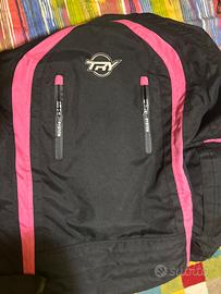 Vendo giubbotto per la moto, da donna, xs , presenta una toppa accanto alla tasca sinistra, ha due tasche interne, di cui una con cerniera, protezioni gomito e spalle.