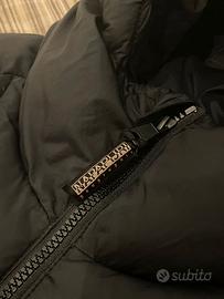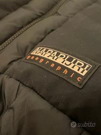 Vendo piumino Napapijri modello Suomi originale, colore nero. Il giubbotto è usato ma in condizioni perfette, senza alcun segno di usura, macchie o difetti. È un capo molto caldo ma estremamente leggero, misura larga XL.