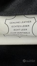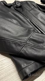 Giaccone Giubbotto modello biker in 100% vera pelle, morbida nappa, colo nero, chiusura a zip. Vintage. Nuovo con cartellino. Mai indossato. Fodera in raso tinta unita perfetta. Tasche interne. Marcato tg 54 da uomo. In foto indossato over da ragazza tg. 40 italiana (h. 174 cm). Veste fino alla tg. 54 da uomo e fino alla tg 50/52 da donna. Unisex.