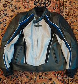 vendo per inutilizzo splendido giubbotto in pelle nera/blu per moto Triumph.