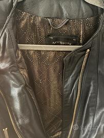 Giubbotto pelle nero con frange nella parte retrostante e lungo le maniche. Interno finemente lavorato con disegni color oro.