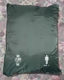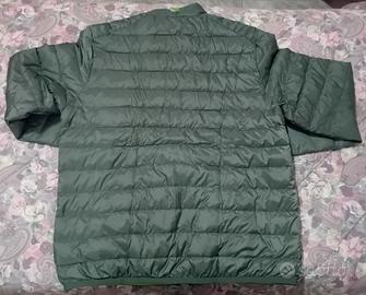 Bellissimo giubbotto piumino impermeabile, per uno stile sportivo, adatto alle attività all'aperto e al tempo libero. Marca BKT Original, taglia L, grigio con dettagli verdi. Ha due grandi tasche esterne da chiudere con la zip, e due interne, una zip per chiuderlo tutto e un bottone per chiudere meglio il colletto. Si può piegare e riporre comodamente dentro la bustina in dotazione.