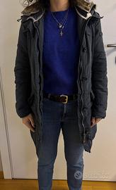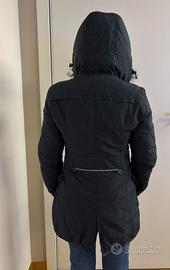 Vengo giubbotto Peuterey con cappuccio, lunghezza media, blu scuro. Taglia XL da bambina compatibile con taglia S da adulta. Piccolo collo in pelliccia staccabile. Tasche superiori rivestite il pile.