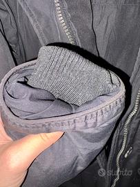 Giubbotto tipo piumino - parka taglia M marca Bata di colore blu scuro con cappuccio e pelliccia staccabile con zip. Bottoni e zip per la chiusura . 4 tasche piu una interna. Cordino per appendino. Polsini.