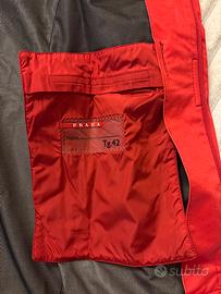 Rosso molto bello, imperdibile, classico tessuto di Prada, tasche interne ed esterne. cerniera davanti e sulle tasche. Indossa un 42 abbondante,