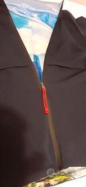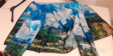 Giubbotto blu anni 16 double face , marca Freedomway, con cappuccio blu estraibile, la cerniera quando chiusa non si vede, con 2 tasche con cerniera sia nella faccia blu, sia nella parte con disegno fantasia panorama