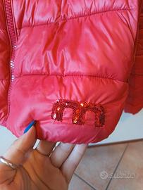 Giubbino rosso sfiancato, con doppio collo. Senza cappuccio. Logo in paillettes.