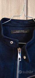 Splendida giacca modello biker firmata Zara Man in color blu navy intenso. Il capo è realizzato in tessuto morbido con un elegantissimo effetto scamosciato (faux suede). Presenta dettagli in stile motociclista con cuciture rinforzate sulle spalle e sulla parte bassa della schiena, che donano struttura e un look grintoso ma rifinito.
