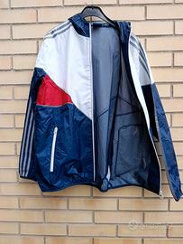 Giacca Adidas sportiva da uomo tipo k way con zip e cappuccio taglia Large realizzata in tessuto croccante in poliammide e foderata in tessuto traforato di poliestere Nei colori sportivi blu scuro bianco e rosso e le tre strisce sulle maniche color grigio Tasche laterali con zip Ottime condizioni estetiche pari al nuovo Misura circonferenza totale torace 120 cm lunghezza giacca 72 cm spalle 50 cm lunghezza maniche 65 cm