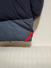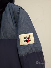 Piumino over imbottito con trapuntatura orizzontale in tessuto di Nylon strech satinato blu e in tessuto di denim jeans. Tasche a filetto ampio,cappuccio regolabile con laccetti, apertura sul centro con bottoni a pressione e zip pressofusa. Slash rosso ricamato sul lato posteriore destro e pendaglio a portachiavi After Label staccabile. Imbottitura interna 90% duck down e 10% piumino. Taglia XL prezzo originario 800€