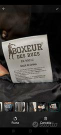 taglia L con cappuccio all'interno del collo,chiusura e zip e bottoni clip, tasca interna e strisce nere di stoffa elasticizzate laterali e sotto le maniche, colore antracite.