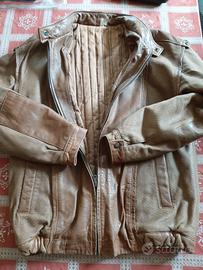 Giubbotto in vera pelle usato con imbottitura interna. Chiusura con cerniera e bottoni metallici a pressione zona colletto (alla coreana) e ai polsini. Rinforzi in pelle area avambracci.