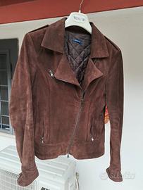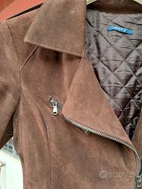 Bellissimo giubbotto in VERA PELLE SCAMOSCIATA marrone scuro, con cerniera sul davanti, sui polsini e sul taschino.