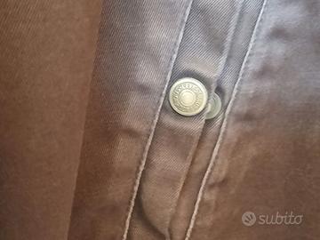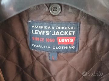 Giubbotto Levi's anni 90 in stile "Harrington jacket" di colore marrone. Il giubbotto presenta un taglio a vita, una cerniera frontale, ed un colletto ampio, caratteristiche tipiche dei giubbotti "Trucker". Il cartellino visibile indica "Levi's Jacket Quality Clothing", che certifica che si tratta di un modello vintage. Il giubbotto è di colore marrone scuro. L'imbottitura interna trapuntata è visibile in un motivo a rombi, mentre la tasca interna, con il suo bordo rinforzato, presenta una trama a coste. I bottoni delle tasche anteriori sono a pressione. La cerniera è YKK, azienda apprezzata per la durevolezza, fluidità, e resistenza dei suoi prodotti. La fodera è 100% poliestere.