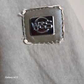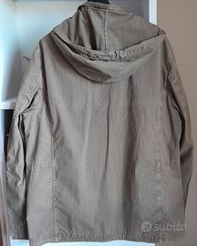 Giubbotto color oliva chiaro, tg. XL, con 4 tasche davanti e 2 due interne, foderato nella parte anteriore, chiude con bottoni e cerniera.Non presenta macchie ne' strappi .Il cappuccio è staccabile. Da ascella ad ascella sono 62/63 cm.