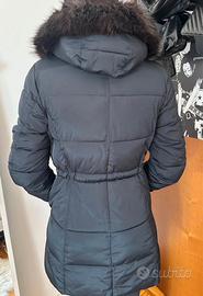 Vendo bellissimo giubbotto invernale nero, modello parka trapuntato, perfetto per le giornate fredde. Il capo è caldo, leggero e rifinito con dettagli eleganti in color oro (zip e bottoni). Dettagli: Cappuccio con bordo in morbida pelliccia sintetica rimovibile. Tasche: Due comode tasche laterali con chiusura a bottone automatico. Vestibilità: Leggermente sciancrato in vita per valorizzare la figura. Condizioni: Ottime condizioni, usato pochissimo. Nessun segno di usura evidente, cerniere perfettamente funzionanti.