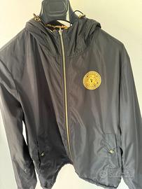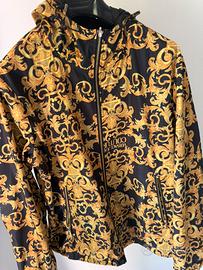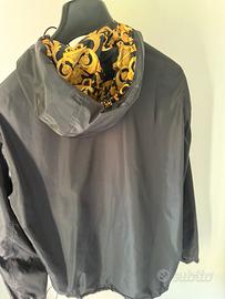 Collo a cappuccio e coulisse sul fondo. Tasche e zip di chiusura frontali. Fantasia Baroque logata.