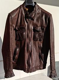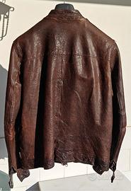 Giubbotto in pelle marrone da uomo, multi tasche con colletto alla coreana con cinturino e fibbia. Chiusura centrale con zip e tasche laterali verticali con cerniera. Vestibilità aderente. Taglia XL.