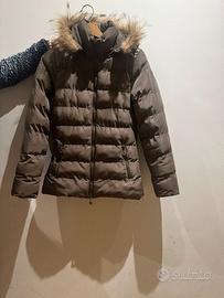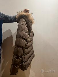 Piumino Moncler da donna di colore beige scuro con cappuccio rimovibile. Imbottitura con vera piuma d'oca.