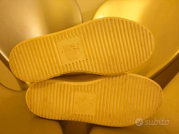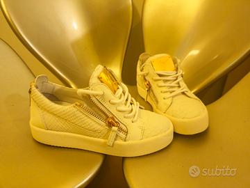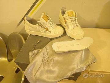 Scarpe sneakers donna / ragazza Giuseppe Zanotti Originali. Colore bianco/panna con inserti oro abbinabile a tutto. Con scatola e sacchetto originale. Usate 3 volte puoi lavate da professionista. In perfette condizioni. Misura 35. Misura soletta interna 23,2 centimetri Misura suola 24,6 centimetri. Interno / esterno in vera pelle. Altissima qualità. Esterno in pelle pitonata - molto belli e di grande effetto dal vivo. Pagate 650 euro. Garantisco l'autenticità del prodotto. Spedizione scatola in scatola. cel / wats 3299169579