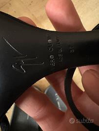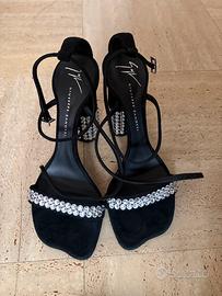 Sandali eleganti neri firmati Giuseppe Zanotti, dal design raffinato e moderno. Modello con cinturino alla caviglia e punta squadrata, impreziositi da dettagli luminosi con strass sia sulla parte frontale che sul tacco. Perfetti per occasioni speciali, serate o eventi eleganti. Condizioni: molto buone, con lievi segni di utilizzo (visibili in foto). Taglia: 37 Un modello iconico che aggiunge un tocco glamour a qualsiasi outfit!