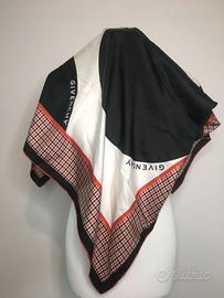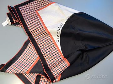 Sciarpa Givenchy Paris, realizzata in 100% seta di alta qualità, questa elegante foulard, nella raffinata combinazione di arancio, nero e bianco, è un accessorio versatile che aggiunge un tocco di lusso al tuo guardaroba. Le dimensioni 90x90 cm la rendono perfetta per essere indossata come sciarpa o foulard, offrendo infinite possibilità di styling. Made in Italy, rappresenta l'eccellenza artigianale del brand Givenchy, con un design sofisticato e senza tempo. Un must per chi cerca eleganza e qualità in un unico accessorio.