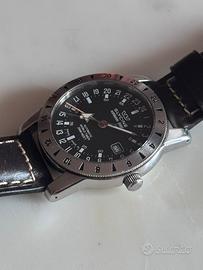 Come da titolo propongo splendito Glycine airman 2000 world timer 200 metri 42mm Movimeto Eta 2893 Completo di tutto il suo corredo originale,bracciale card e boxe. Anni 90/2000 Valuto proposte di scambio con altri orologi Longines,tag heuer,nivada,omega Garantisco l’originalità dell’oggetto da me venduto