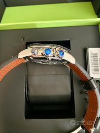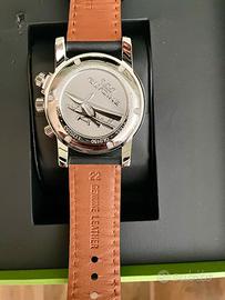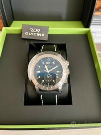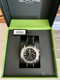 Orologio nuovo Glycine Airman gmt black date Movimento al quarzo (Glycine Calibre 6203B) Diametro cassa : 42 mm esclusa corona Larghezza del cinturino : 22 mm Lunghezza del cinturino : circa 23 cm Vetro : zaffiro Corona : corona a vite Cassa : acciaio Cinturino : pelle Dotato della funzione GMT/Dualtime alla posizione delle 6 e di una visualizzazione della data alla posizione delle 12 .