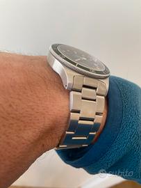 Versione rara con ghiera verde, movimeto automatico Sellita sw200 Swiss Made, cassa e bracciale acciaio satinato da un professionista al costo di 50 euro, indossato una decina di volte in ottimo stato. Comprato per collezione. Aprile 23. Full sett con scatola e documenti. No affaristi, solo appassionati.