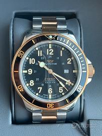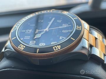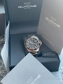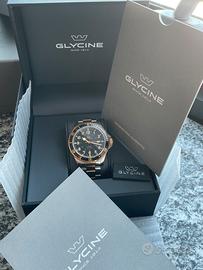 Glycine, questo modello è dotato di un movimento automatico calibro GL 224, con una riserva di carica di 38 ore. La cassa è realizzata in robusto acciaio inossidabile con un diametro di 46 mm (larghezza della cassa esclusa la corona), uno spessore di 13 mm e un quadrante nero. Il GL0293 presenta un cinturino in acciaio inossidabile color argento e oro rosa con chiusura déployante. Il vetro dell'orologio è in zaffiro antigraffio. Inoltre, questo modello Glycine è resistente all'acqua fino a 30 bar (300 metri) ed è dotato delle seguenti funzioni: data, ora, minuti, secondi. Condizione: Come Nuovo compreso di confezione originale, scatola contrascatola e documenti originali. Unico difetto, ha un piccolo graffio sul fianco ( foto 6)