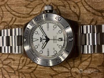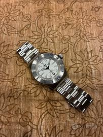 Orologio in ottimo stato, piccolo segno superficiale sulla corona a ore 6, full set. Movimento Sellita GL224 automatico. Cassa in acciaio 42mm, quadrante bianco. Impermeabilità 200m. Solo scambio a mano in zona Anzio e dintorni, o cisterna di Latina e dintorni. Prezzo poco trattabile, valuto scambi e permute.