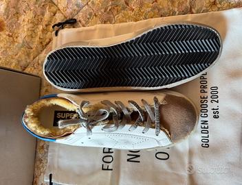 Vendo sneaker Golden Goose Super-Star in pelle bianca e camoscio con talloncino blu MAI indossate. Vendo per errore numero. Taglia n. 39