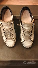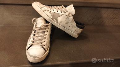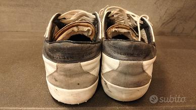 scarpe Golden Goose 43 usate risuolate recentemente con fascione e suola nuova in più è stato rifatto le racchette nuove dove struscia il tallone sono state sostituite le solette interne perché rovinate per il resto rimango a disposizione per chiarimenti e foto