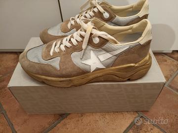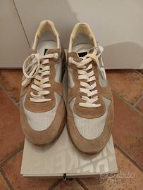 Modello: Running Sole. Si riconosce per la suola chunky "effetto vissuto" con dettagli dipinti a mano e la tomaia che mescola materiali diversi come nylon, suede e nappa. •Colorazione: Dalle foto si nota una combinazione di colori argento, bianco, beige e tabacco.