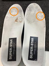 Sneaker modello Super-Star di Golden Goose, caratterizzate da un design distintivo che unisce elementi camouflage a dettagli luminosi in glitter d'argento.